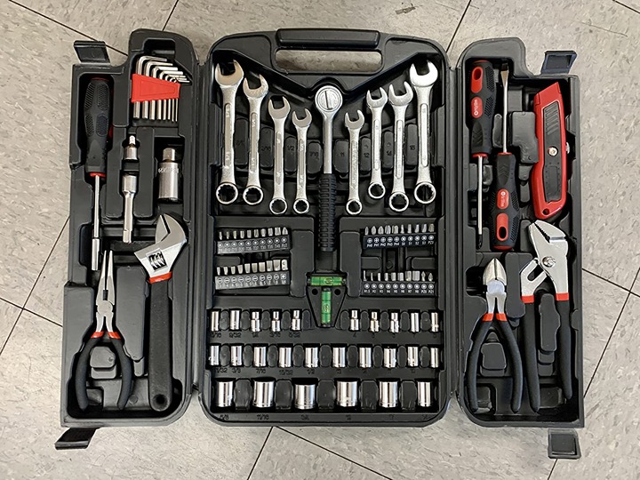 This 95 piece kit contains the basic tools needed for daily use and can be used for most small repairs around the house. It can be used to repair leaking kitchen or bathroom faucets, repair bicycles, or DIY.