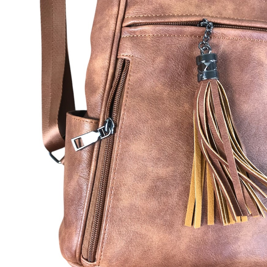 - Convertible design (backpack to shoulder bag) makes this convertible backpack suitable for a variety of use scenarios; and the design with colorful shoulder straps and tassels makes the leather backpack distinctive.