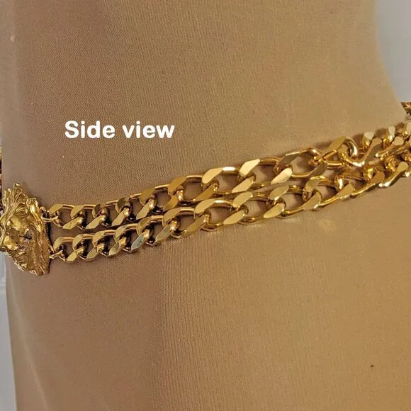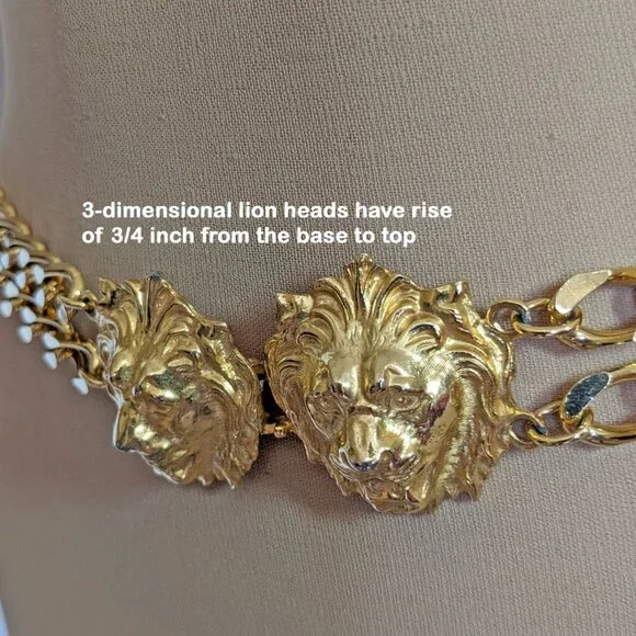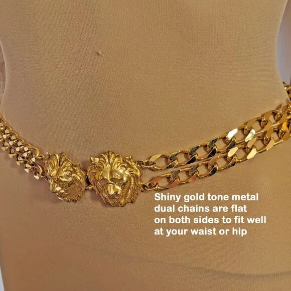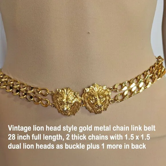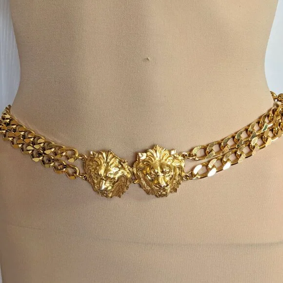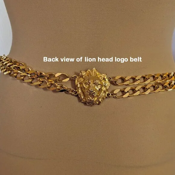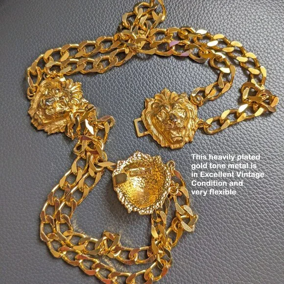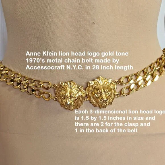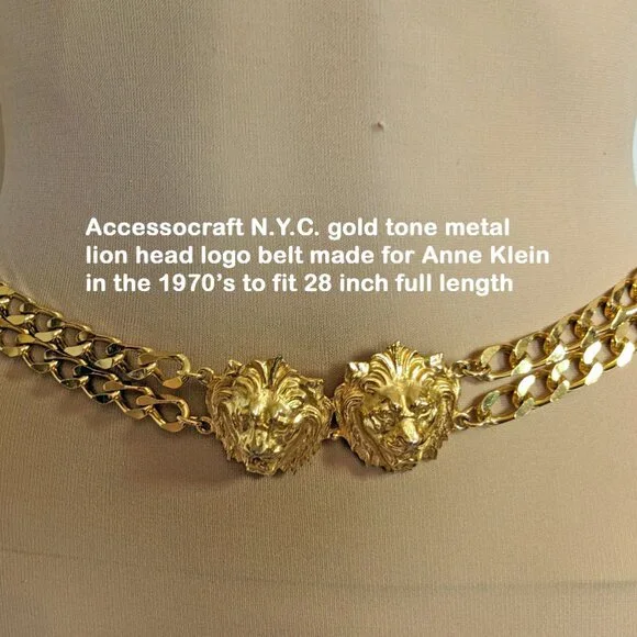 Beautifully made by Accessocraft N.Y.C., this Anne Klein lion head logo gold tone metal belt has 2 heavily plated chains and a set of 3-dimensional lion heads as the buckle. One more lion head accents the back of the belt. Each of the front lion heads are 1.5 by 1.5 inches, so when the belt is clasped the front will be 3 inches total.The dual 3/8 inch wide chains are flat on either side so they will hang fabulously at either your waist or hip. Extremely well made, with high quality metal, this chain is very flexible. The full weight of this belt is just over 10 ounces and it is so well designed that it feels just right when you wear it.As you can see from the photos, this belt is signed with the logo and copyright symbol on the reverse side of the belt buckle.I can attest to the age of this because I have owned and worn this versatile belt since the late 1970's when I bought it at Neiman Marcus. This unique belt is still in Excellent Vintage condition with absolutely no wear evident. The quality of the workmanship is proof of the material used for this belt.Accessocraft, a New York City-based jewelry company, was founded in the 1930s by Edgar Rodelheimer and Theodore Steinman. Initially known for manufacturing hardware for handbags and shoe buckles, Accessocraft later produced items for prominent designers like Anne Klein and Pauline Trigère. Please ask any questions before making your purchase.