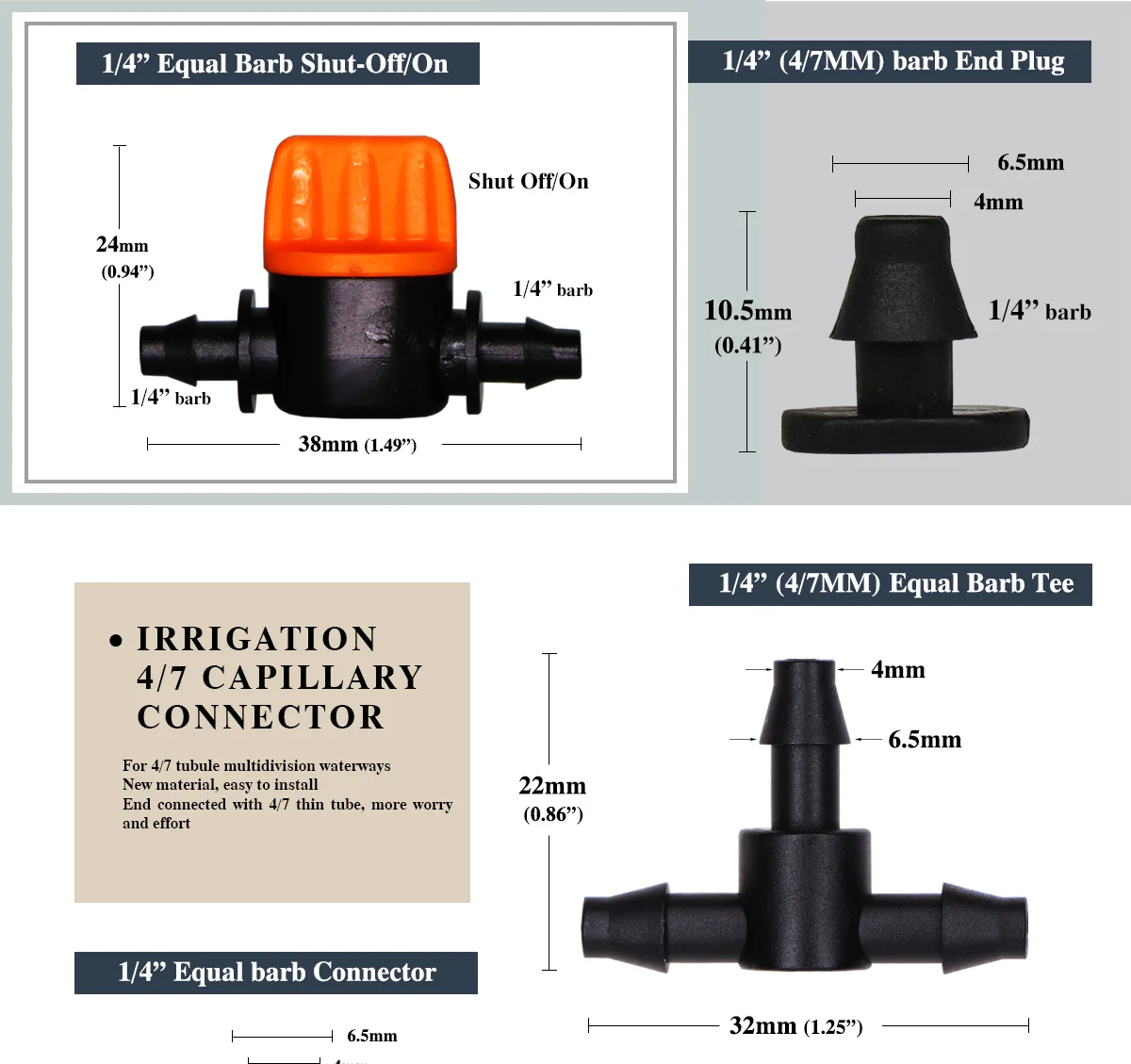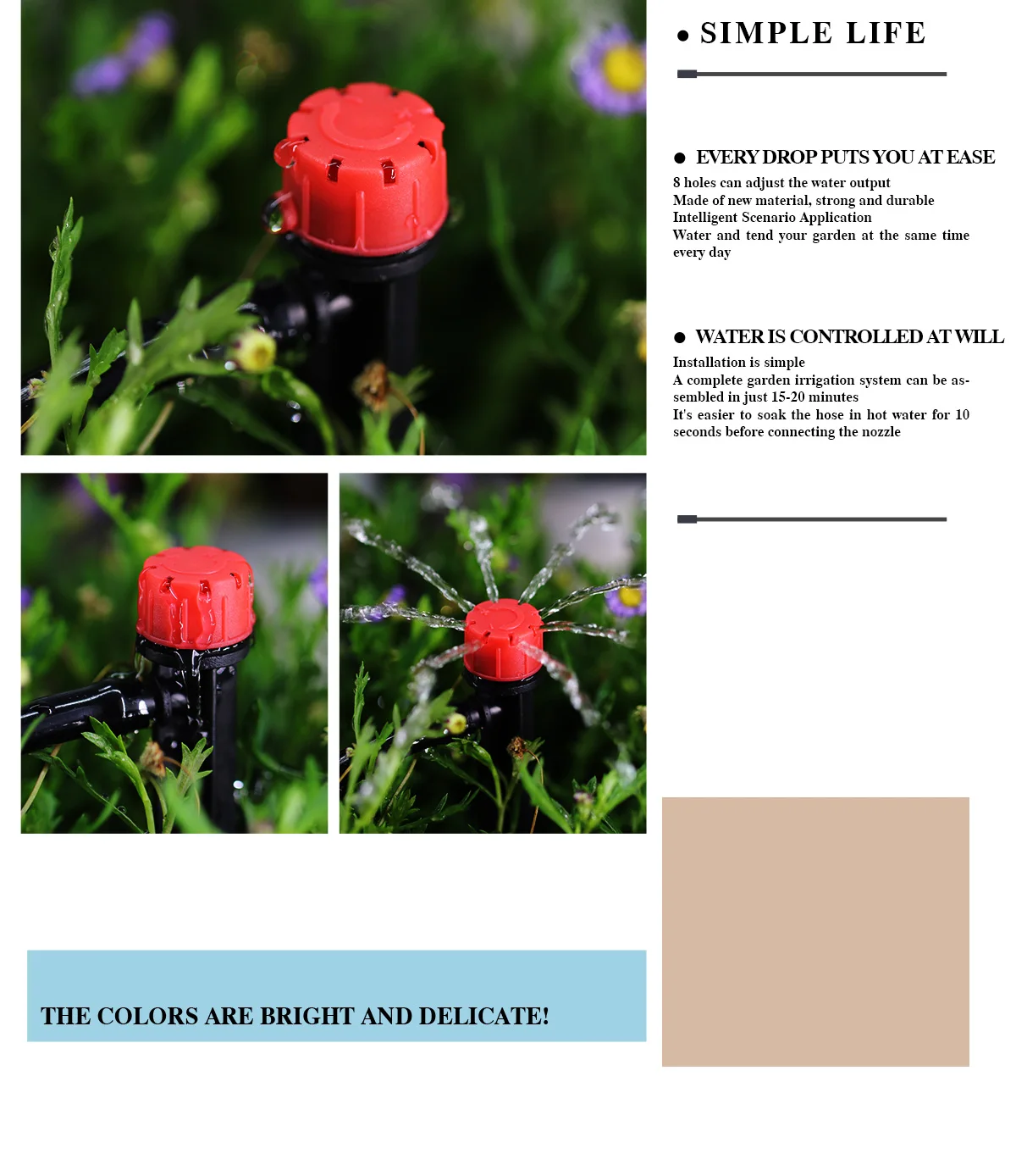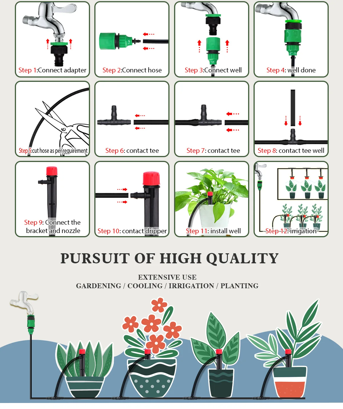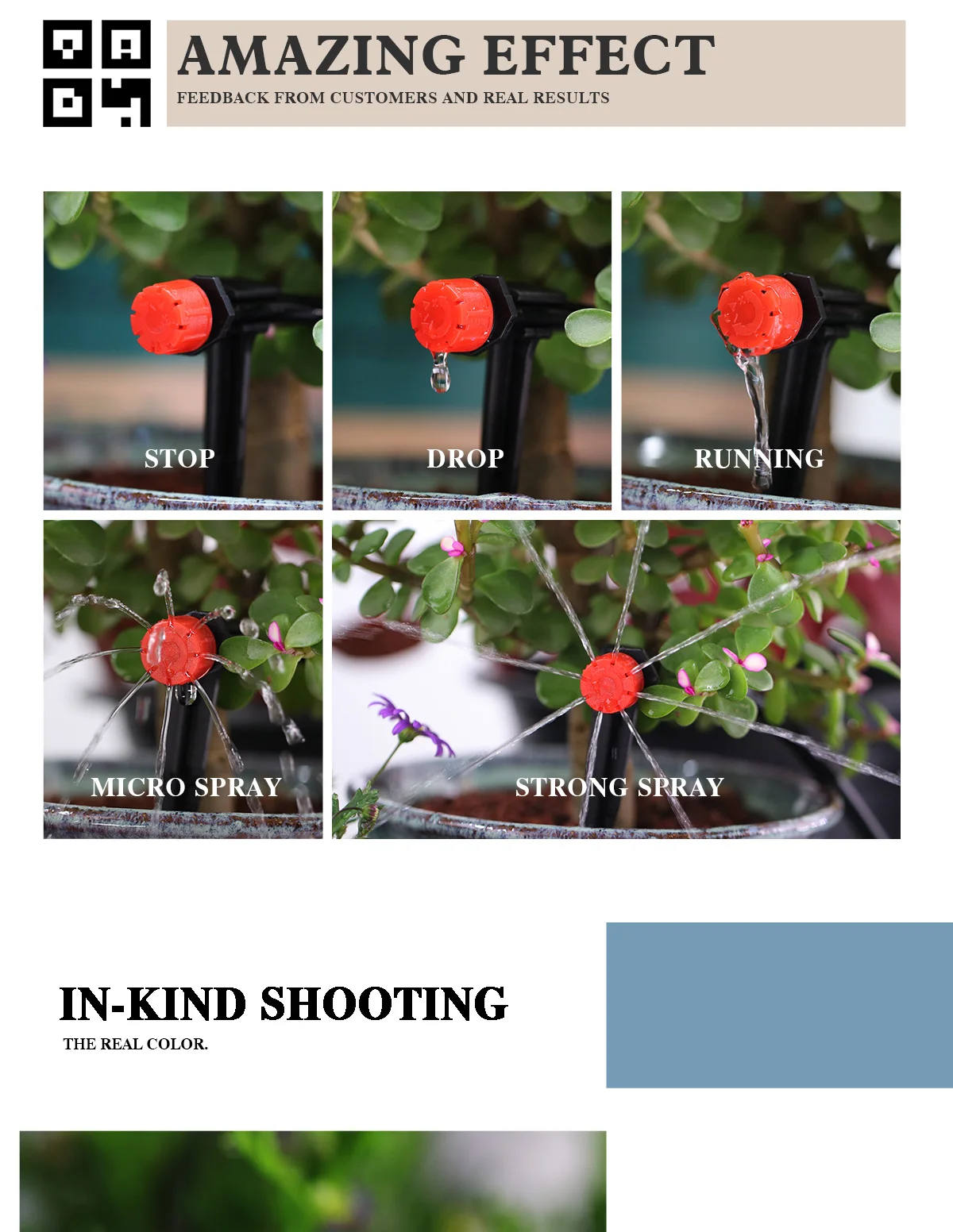 ☺ Scope of Application:Suitable for pots, tubs, ground cover, landscaped gardens, flower beds, vegetable gardens, herbs gardens, vegetable garden, herbs garden, lawn, greenhouse, orchard, lawn, self plant and garden drip irrigation system so on. Tips: Soften the tube hole with hot water before connecting the tube and dripper.