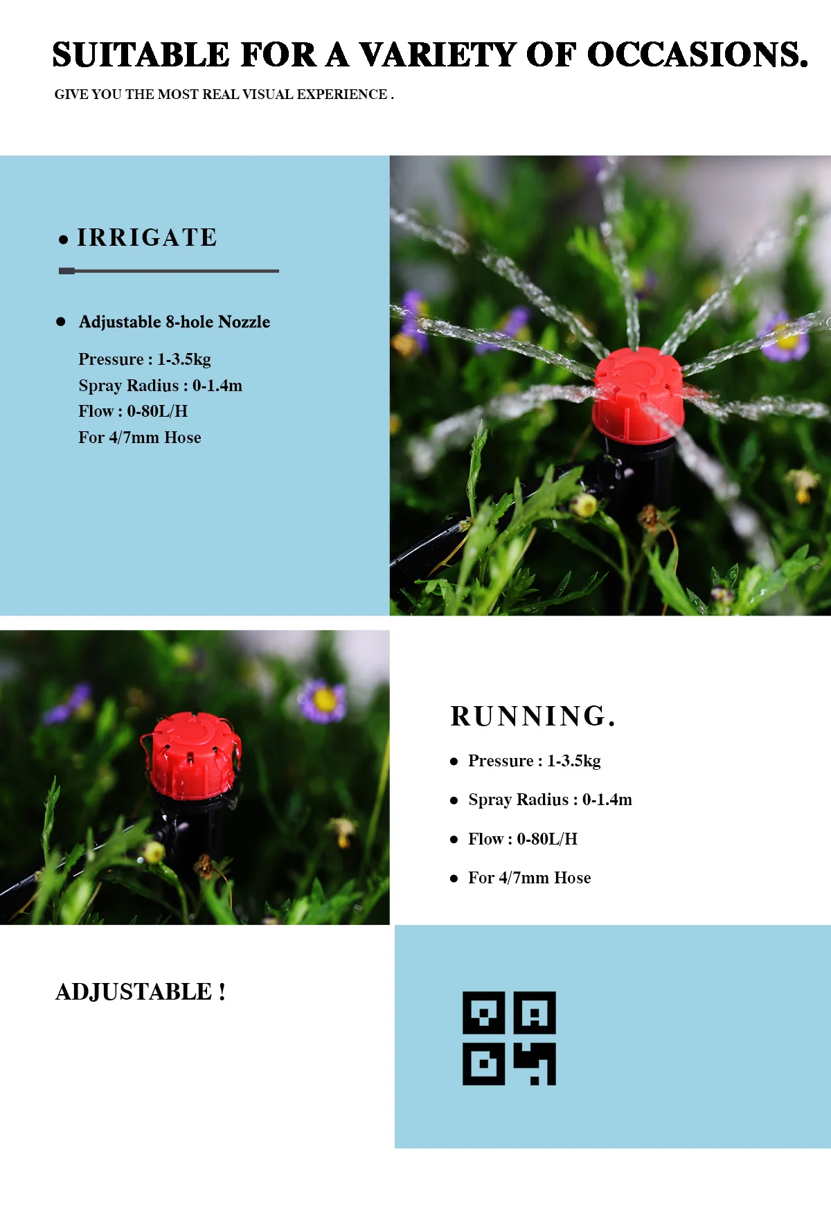☺ Each dripper has 8 outlet holes at the top so as to provide 360 degree coverage. You can adjust water flow from 0-30 L/h to 0-70 L/h and water range from 0 to 0.2 m by tightening or loosing the water outlet hole cap.