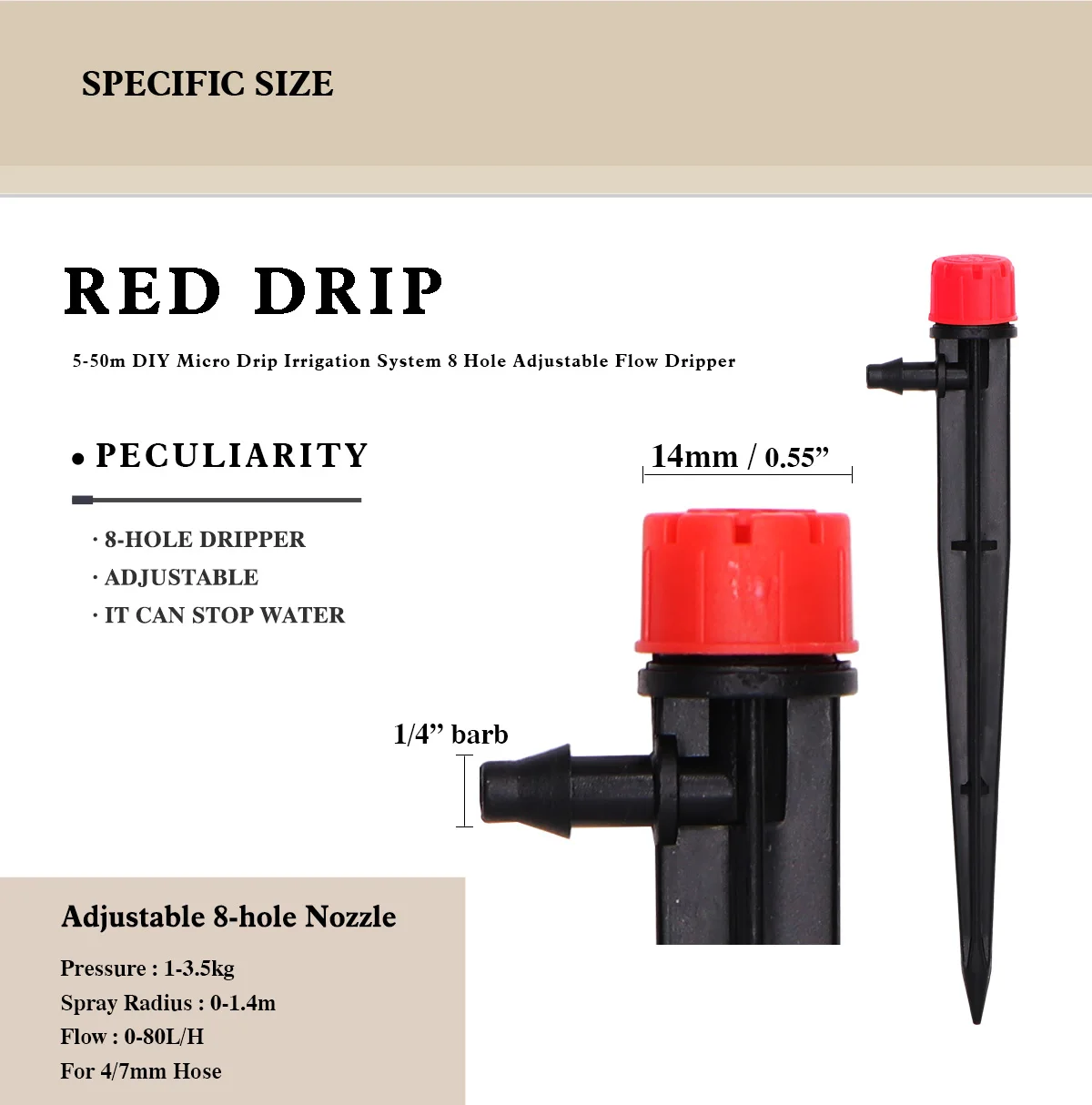 ☺ Suitable for 4/7mm (Inner/Outer diameter) tube. Each dripper has 8 outlet holes at the top,360 degree full irrigation.