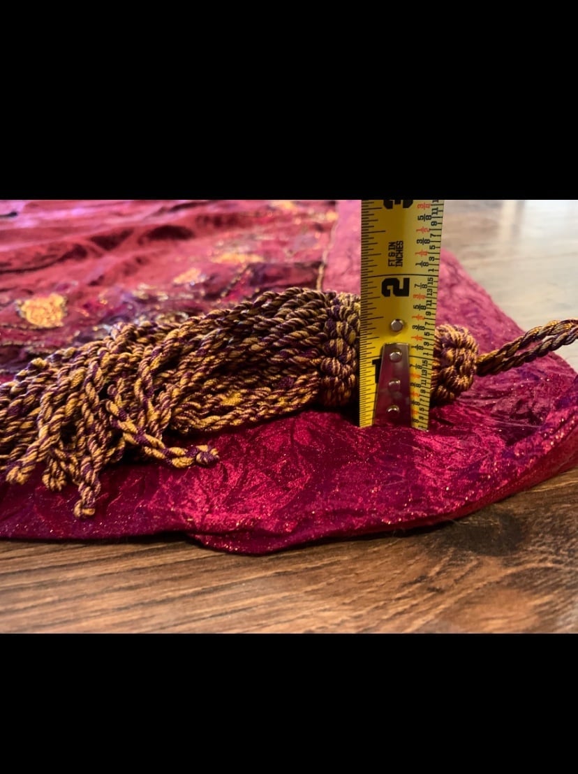 Add a festive touch to your Christmas tree with this rare XL tree skirt. The skirt is made of a combination of rayon and cotton materials, velvet, beaded, large tassels, & features intricate stitching and beadwork in a vibrant maroon, red color. The large tassels add a unique and fun touch to the holiday decor. Connected with beautiful, large, velvet buttons.