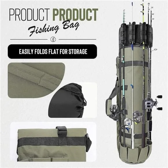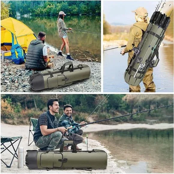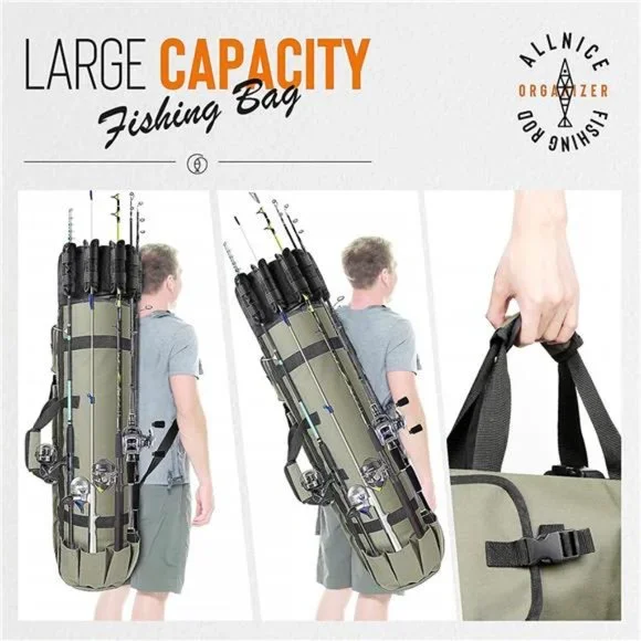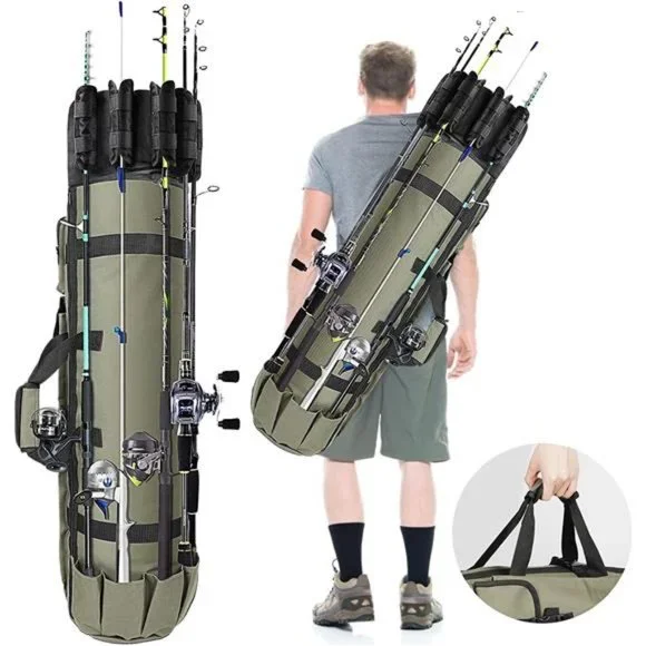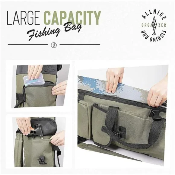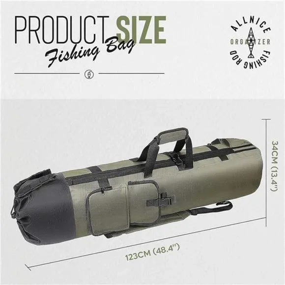 -Large Capacity- Dimension: 123cm(48.4')'*34cm(13.4'') (L*D). 5 rods and reels pouch outside, 2 lateral pocket and 1 large interior compartment. Enough to hold your fishing rod, fishing reel, fishing bait and other fishing tools in order without any mess.-Well-selected Material: Well made of high-quality 600D oxford cloth, ultra tear-resistant and abrasion-resistant, extremely durable to use.-Perfect Details: Securely fastened with double straps at top of bag and features a quick fastener strap around the outside center that secures gear during transport, quite convenient to use.-Double shoulder strap and handheld strap Design: With adjustable double shoulder strap, solid and reinforced, allows you to adjust the length according to your own need. Equipped with a hand strap, it can be carried on the shoulder or in the hand.-Fishing with Fun: This fishing bag is specially designed for fishermen, perfect to store fishing rods, fishing reels and other fishing tackles.