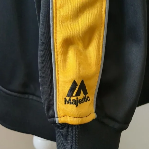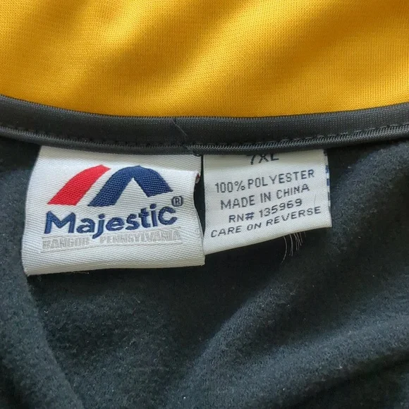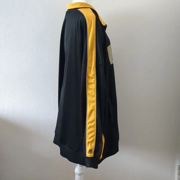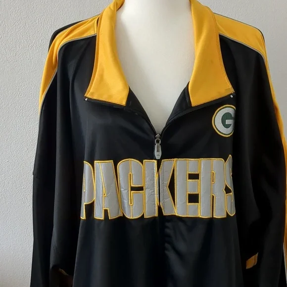 Green Bay Packers NFL Majestic Full Zip Track Jacket Black Size 7XL.The Green Bay Packers NFL Majestic Full Zip Track Jacket in black is a size 7XL men's jacket officially licensed by the National Football League (NFL). Made by Majestic, this jacket is perfect for fans of the Green Bay Packers looking to show their support during the regular season. With its classic design and high-quality construction, this jacket is a must-have for any football enthusiast. Made in China, this jacket is a great addition to any fan's wardrobe, combining style and team spirit in one versatile piece.Condition is pre-owned very good.