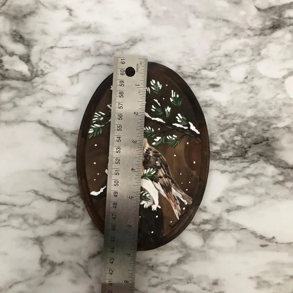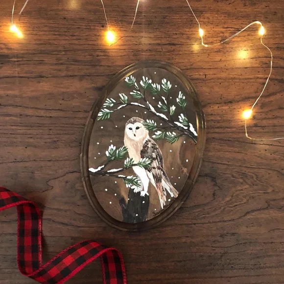 Hand Painted Winter Barn Owl Wooden Plaque, Small Oval Wood Plaque Gallery Wall ArtThis little wooden plaque was hand painted by me :)I love collecting and shopping for vintage goods for my transitional-style home. This plaque is inspired by real vintage gems I’ve found in the past, but with my own creative spin. Each piece is stained with acrylic paint to give it a vintage, worn-in look. This would make an excellent addition to any gallery wall, bookshelf, or space of your choosing. It would also be the perfect gift for any owl lover in your life! Have questions? Just ask!