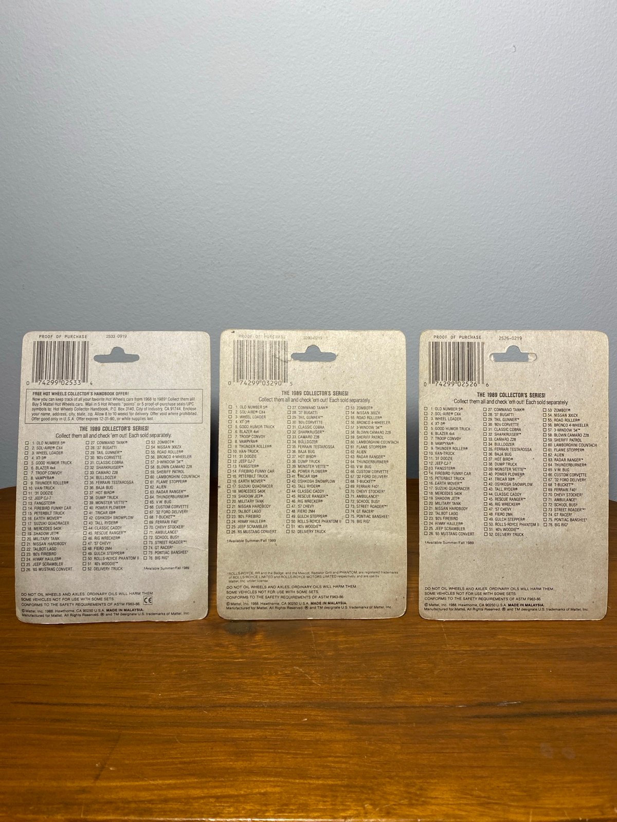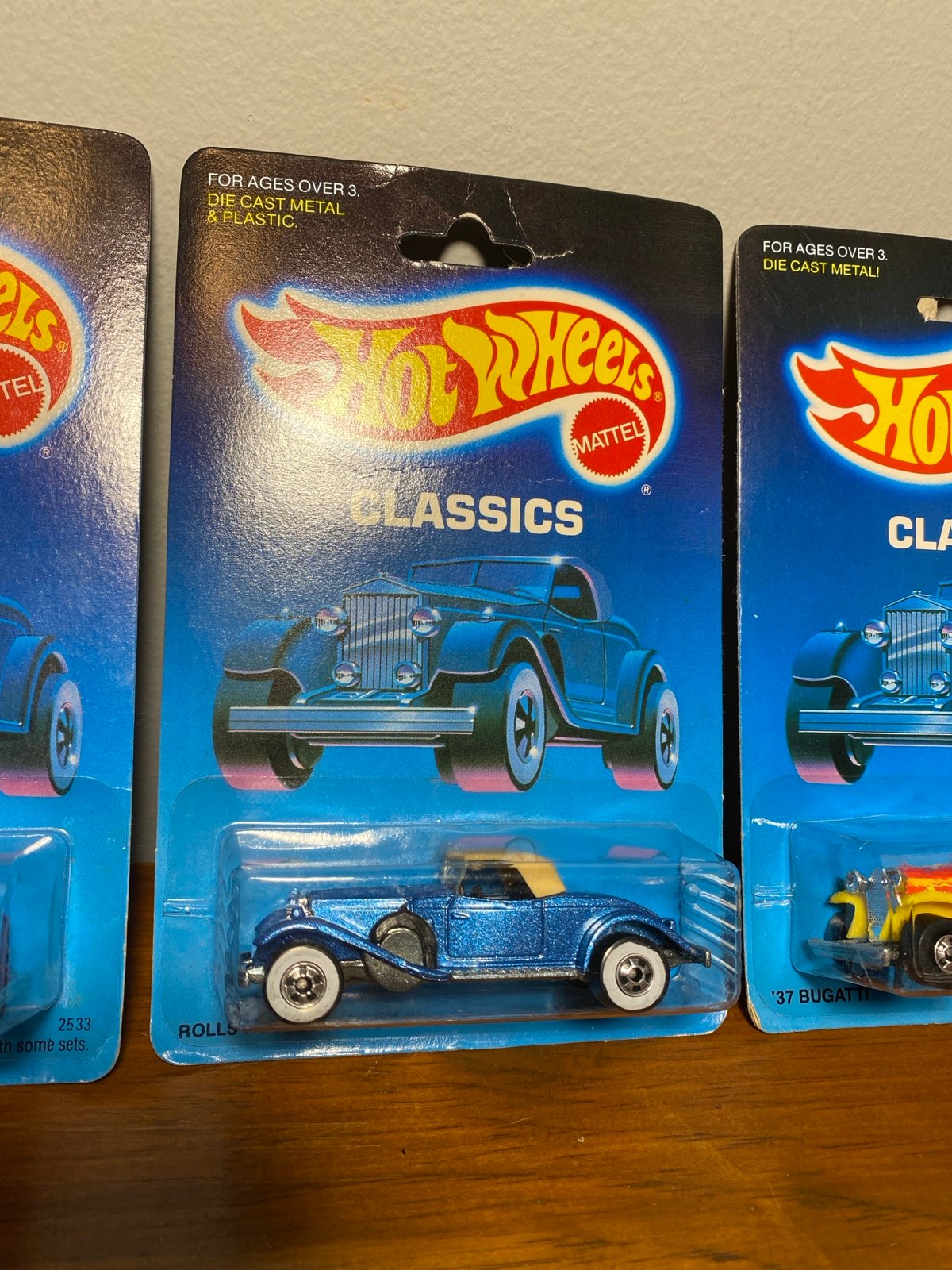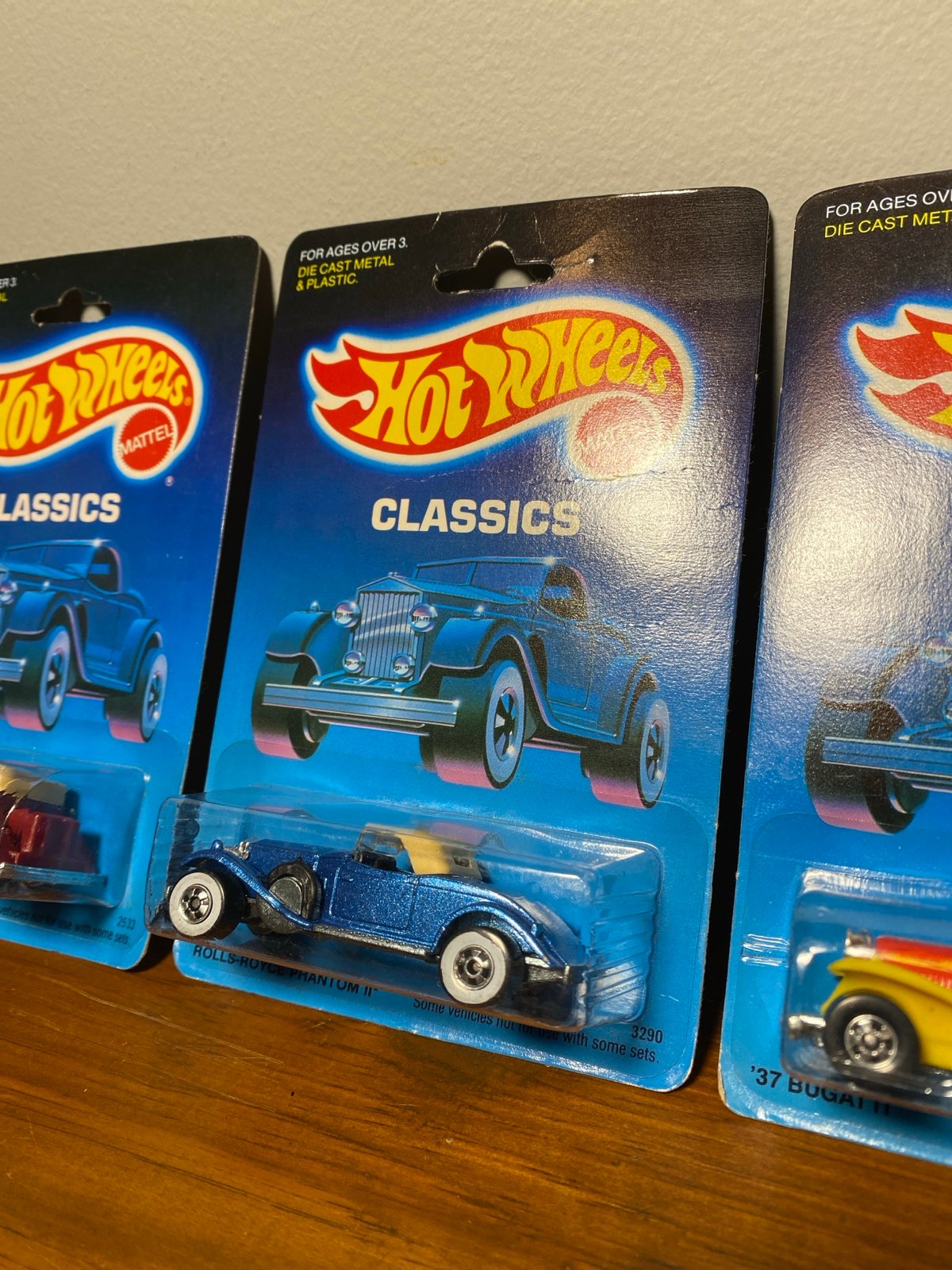 Lot of 3 Hot Wheels Classics dated 1988. Includes the 31 Doozie, Rolls Royce Phantom II, and ‘37 Bugatti. They’re unopened but the cards show storage wear. Please see photos for condition. Will ship securely in a box.