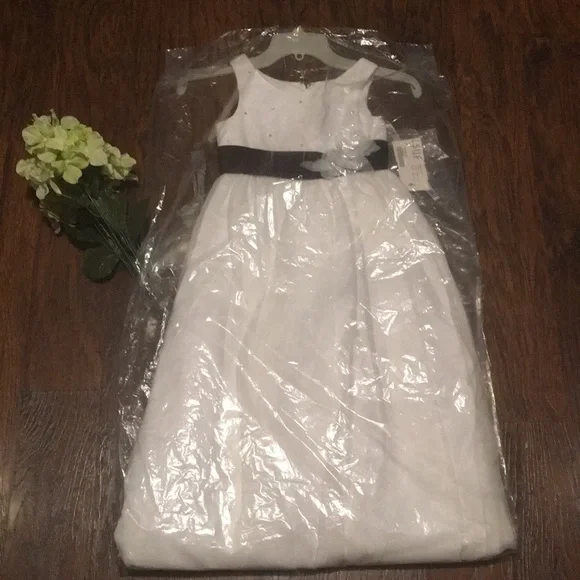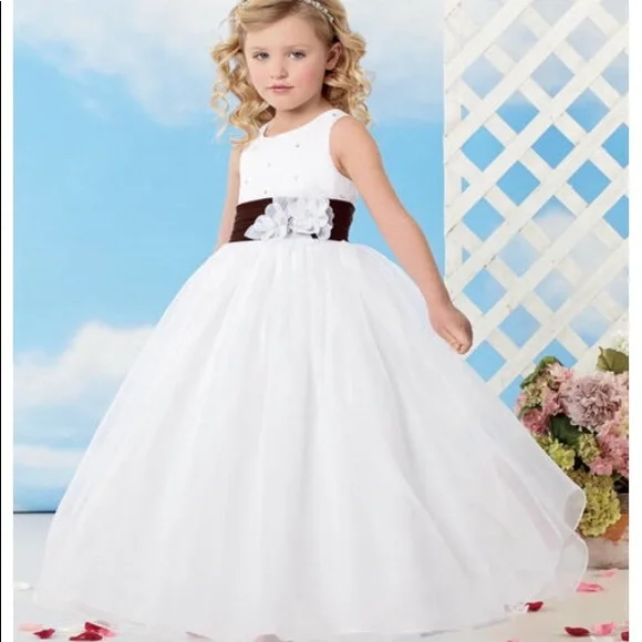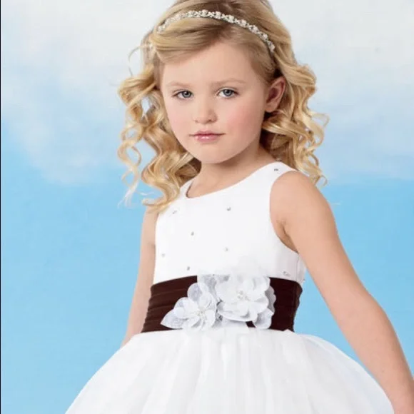 FREE SHIPPING! This beautiful dress will be sure to make your little darling stand out. Organza Flower embellishment on the front.Size chart included for this dress(size 6). Shown in White/Chocolate�Floor length Organza dress with rhinestone detail on bodice. Pleated Satin waistband with organza flowers. L511F(floor length). Feel free to ask questions and specifics on how you would like your dress packaged. Thank you kindly☺️Kind offers considered🌼💗