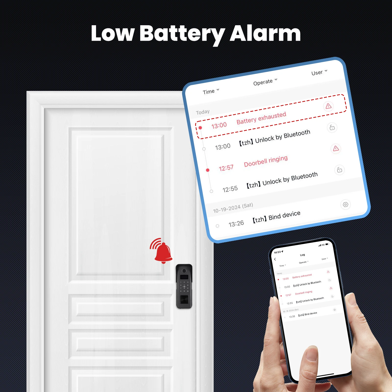 Low battery alarm function: when the battery is low, the door lock will not only sound an alarm to remind you, but the low battery status will also be automatically recorded in the APP log to ensure that you replace the power supply in time to avoid interruption of use.
