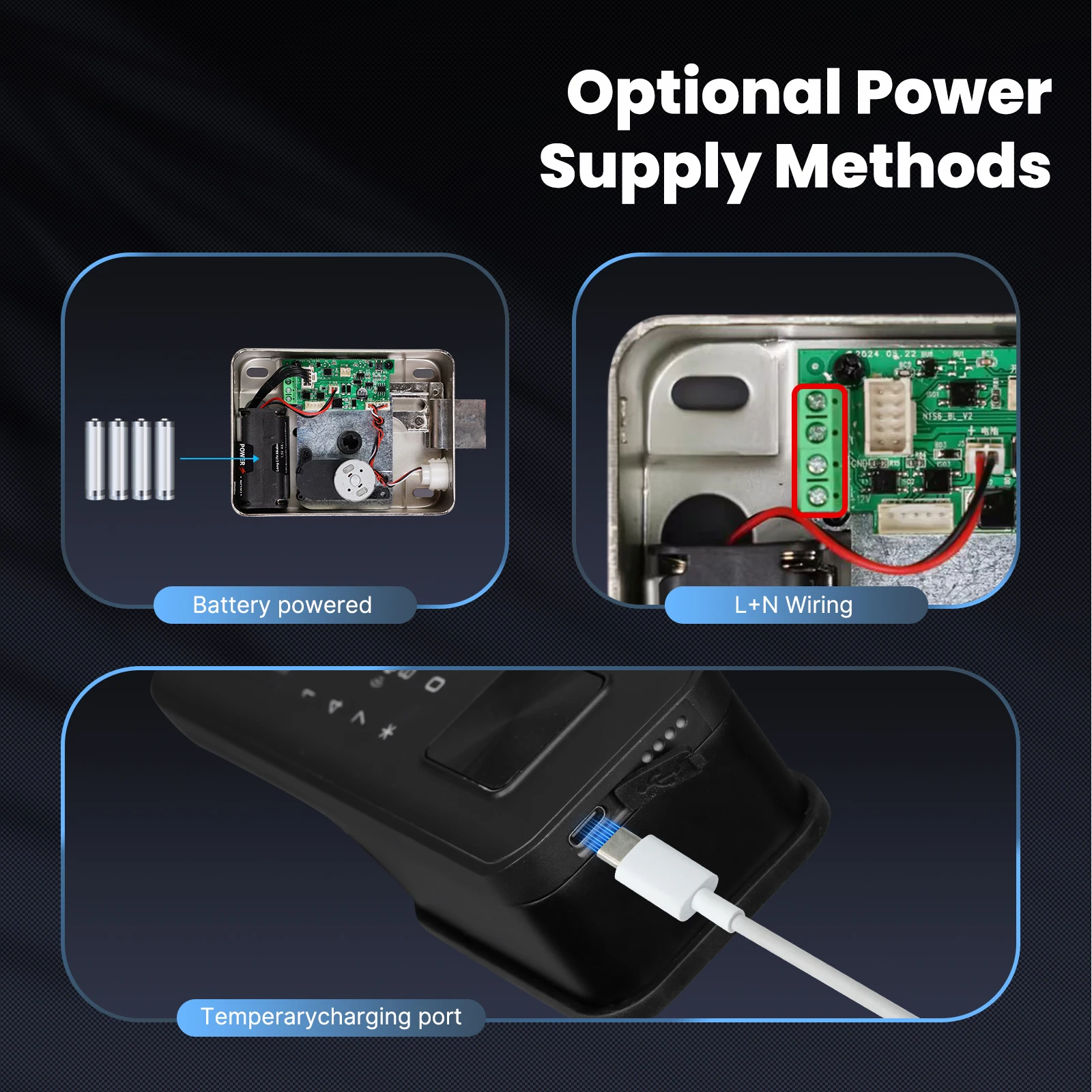 The power supply mode is flexible and optional, providing three options: battery power supply, wiring power supply and temporary charging port, ensuring that the door lock can operate stably under various conditions.