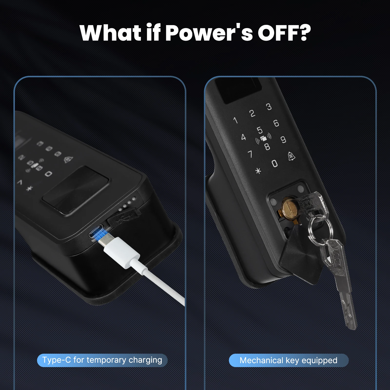 If the door lock runs out of power, don't worry. The door lock is equipped with a temporary charging port for quick emergency charging; at the same time, it also supports key unlocking, ensuring that you can enter smoothly at any time.