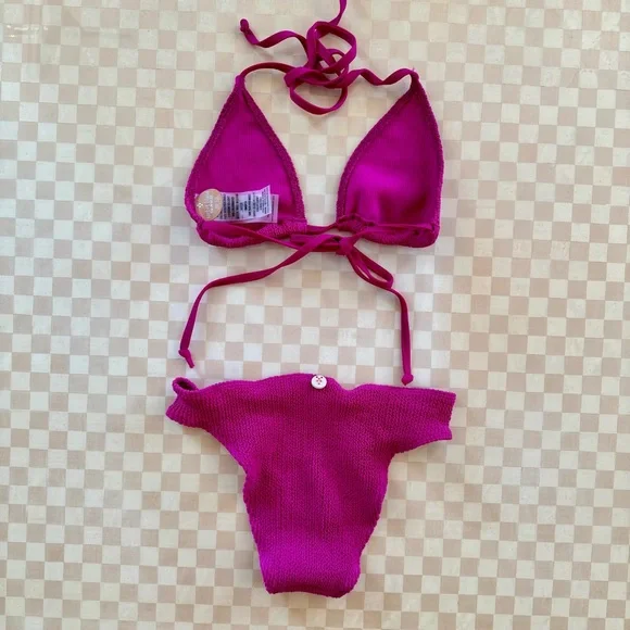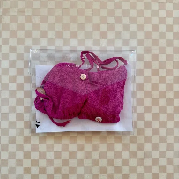 BRAND NEW Sorbet Island Bikini in Acai MagentaMia" ONE SIZE FITS MOST BikiniThis ONE SIZE FITS MOST swimwear is designed to celebrate each and every female silhouette. Made from the thinnest, lightest crinkle fabric with fine seams, it fits XS-XXL, from A to G cup. It comes in a unique recyclable beach clutch with stickers to personalize it.-Made in Athens, Greece-No padding in top