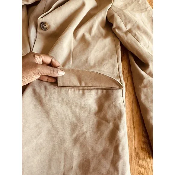 Step into sophistication with this Topshop blazer. Its tailored fit and neutral tone make it versatile for both professional and casual settings. The belt accentuates the waist, adding a touch of elegance. Elevate your wardrobe with this timeless piece that pairs effortlessly with various outfits.• Single-breasted design• Front button closure• Two faux pockets• Belted waist for adjustable fitLong Lapel