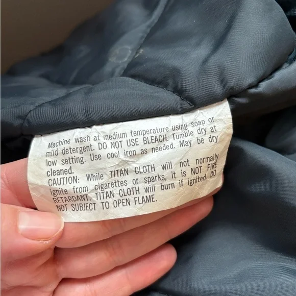 Navy JacketSize 44, fits like a Large for menTitan Cloth construction, known for their weather-resistant propertiesQuilted lining for insulationMultiple pockets for storageHeavy-duty zippers and hardwareThere is usually a hood that zips on but it was not attached