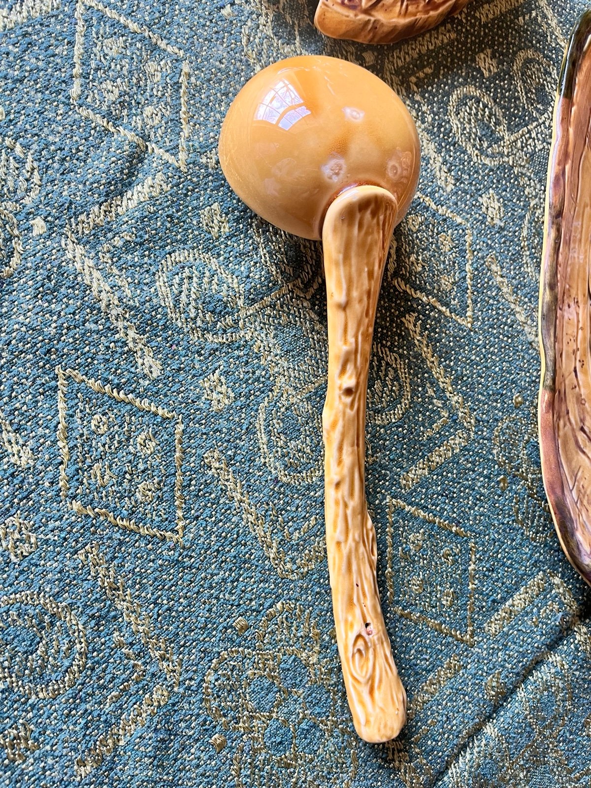 This vintage Lefton soup tureen is a true gem for collectors. The tureen showcases a delightful Mushroom Forest pattern, adding a whimsical touch to any gathering. Its generous size and single compartment make it ideal for serving soup, stew, or other delectable dishes. The set includes a matching underplate and ladle, both adorned with the same vibrant design.