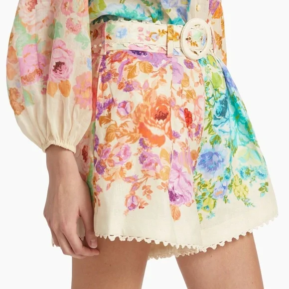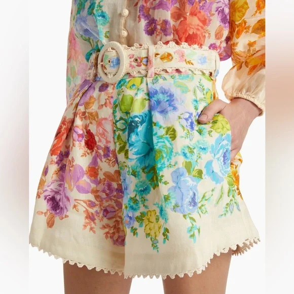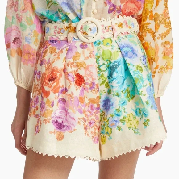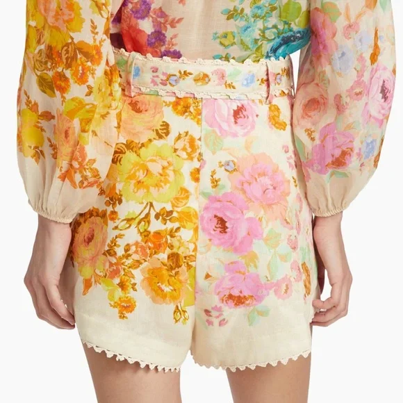 Zimmermann Size AU2; Us 6-8Purchased from Saks.comWorn Twice. Dry Cleaned. No flaws! Gorgeous!!Crafted of airy linen with a whimsical floral motif, Zimmerman's tuck shorts showcase charming pleated-front and wide-leg opening-decorated with scalloped trimming. This playful style features a picot lace-trimmed belt and a raffia O-ring buckle.Details:• Banded waist, belt loops• Adjustable belt• Side slit pockets• Hidden back-zip closure• 100% linen• Lining: 100% cotton• Trim: 100% imitation raffia• Embroidery: 100% polyester• Dry clean• ImportedSIZE & FIT• Waist, about 28"• Rise, about 15"• Inseam, about 2"• Leg opening, about 29"• Model measurements: 5'10" tall• Model is wearing a US size 4Please Note: Compared to the Brand's Size Guide, this style measures true to size.